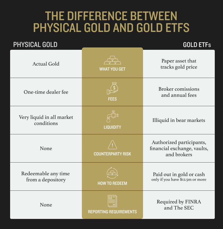 Finally, there are differences between the reporting requirements of ETFs or gold stocks and physical gold. Transactions and account openings must follow the stringent reporting requirements of FINRA and the SEC. By contrast, there are potentially no reporting requirements when buying or selling physical precious metals. This lack of paperwork makes the process more private and less burdensome than investments in gold ETFs.