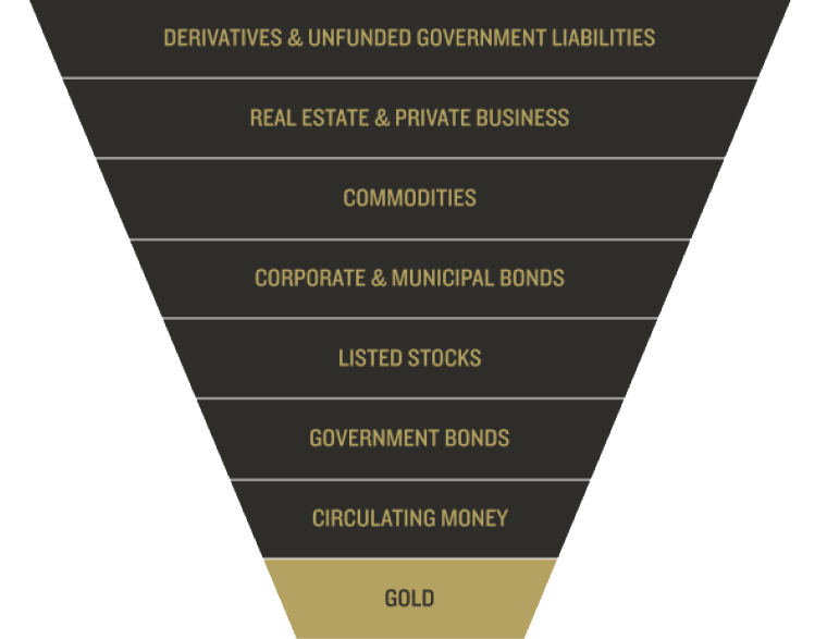 Exter’s Pyramid of Liquidity displays the liquidity of assets in a hierarchy: From the most illiquid assets, complex derivatives and real estate, the pyramid progresses to the most liquid asset, physical gold.